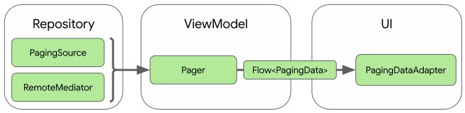 Paging3 라이브러리는 구글에서 제안하는 안드로이드 아키텍처와 호환이 잘 되도록 설계되어 있습니다. 예를 들어 클린 아키텍처에서는 Data Layer에 Repository가 있고 UI Layer에 ViewModel이 있는데, Paging3 라이브러리의 아키텍처를 구현할 때도 클린 아키텍처의 계층에 맞춰서 구현하면 되기 때문입니다.