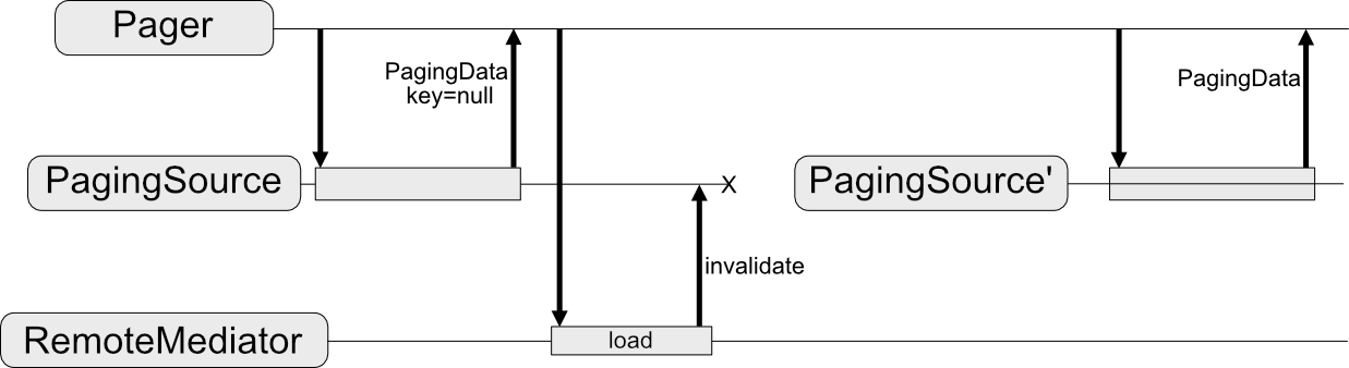 즉, 아래의 그림과 같이 Pager가 모든 페이징 데이터 보여줬거나 기존 데이터가 없을 때, 다음 페이지에 대한 항목들을 보여주기 위해 RemoteMediator를 통해 네트워크에서 다음 데이터를 불러옵니다. 그리고 가져온 데이터들을 로컬 데이터베이스(Room)에 저장하면 UI가 자동으로 업데이트되는 원리입니다.