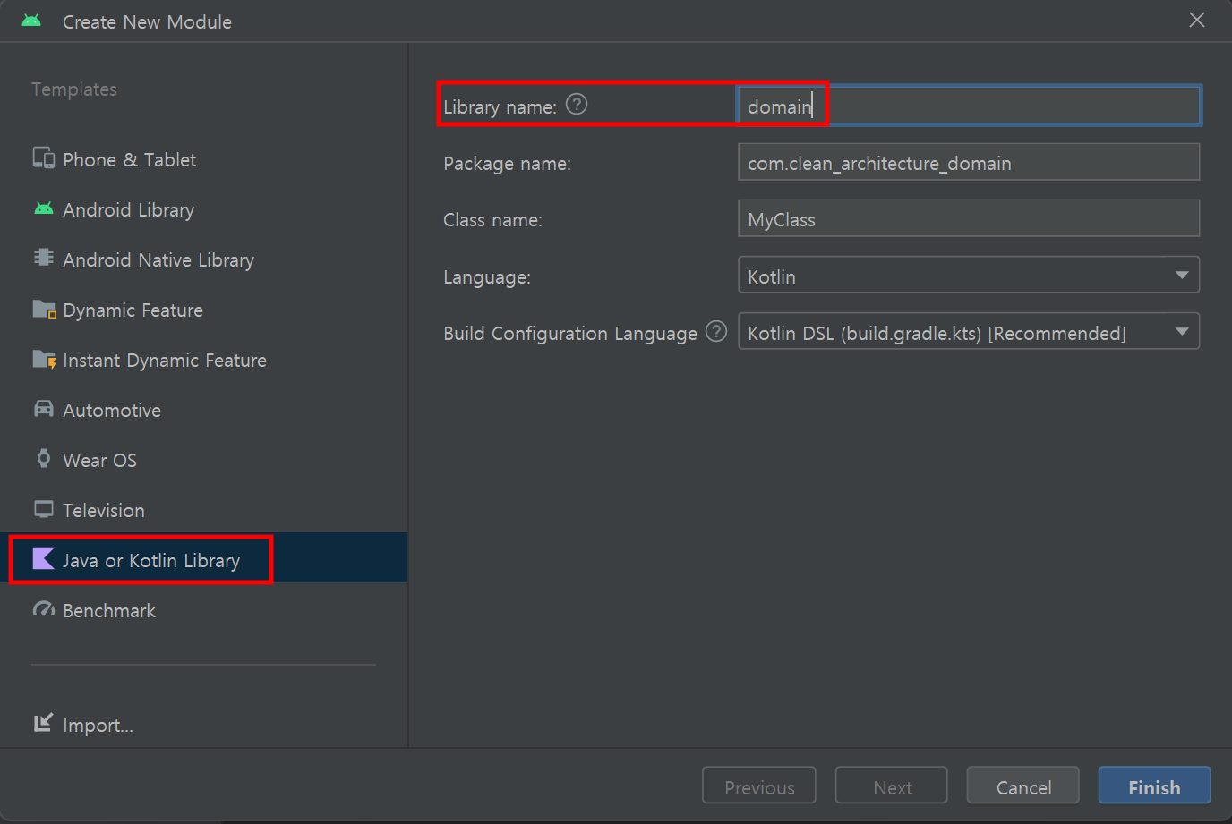 안드로이드 스튜디오에서는 각 계층을 별도의 모듈로 구성하여 의존성을 관리합니다. File > New > New Module을 선택하여 새 모듈을 생성합니다. Domain Layer용 모듈을 생성할 때는 안드로이드 프레임워크나 라이브러리에 의존하지 않는 'Java or Kotlin Library'를 선택합니다. Domain Layer는 어떤 플랫폼에도 종속되지 않는 계층이기 때문에 아래와 같은 이유로 'Android Library'로 생성하지 않고 'Java or Kotlin Library'로 생성합니다.