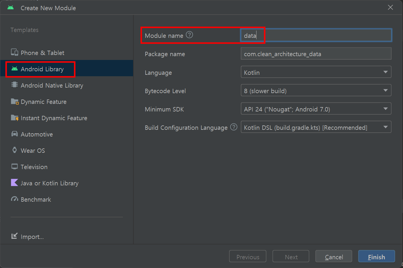 Data Layer에서는 데이터 저장소와의 상호작용을 담당하는데, 안드로이드 플랫폼에 특화된 기능과 API를 활용하기 위해서 반드시 'Android Library'를 선택해서 모듈을 생성해야 합니다.