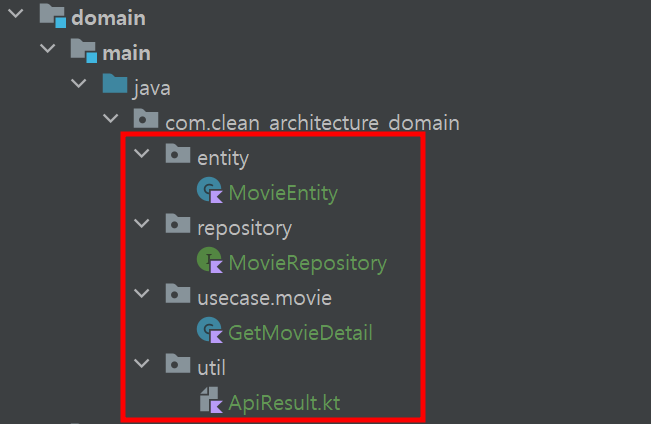 Domain Layer는 크게 엔터티(Entity), 레포지토리 인터페이스(Repository Interface), 유스케이스(UseCase)로 구성됩니다. 필요에 따라서 util 함수가 추가될 수 있습니다.